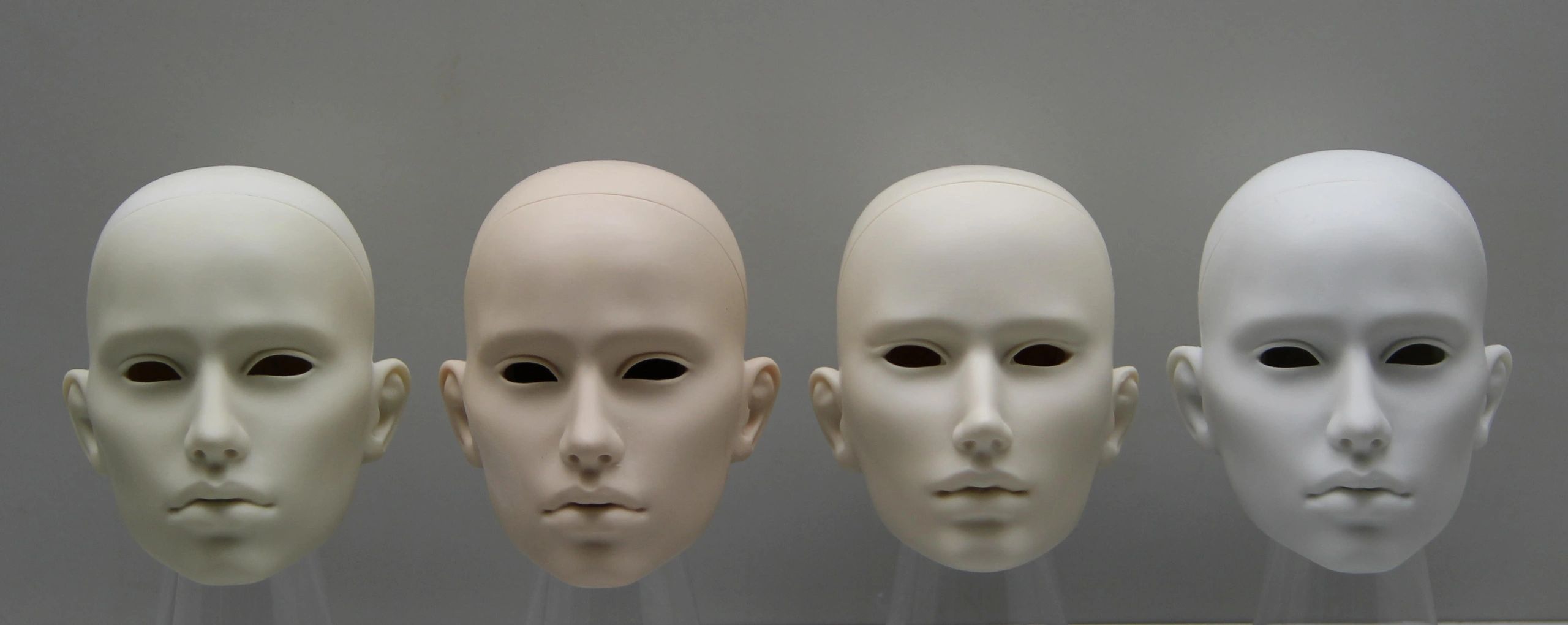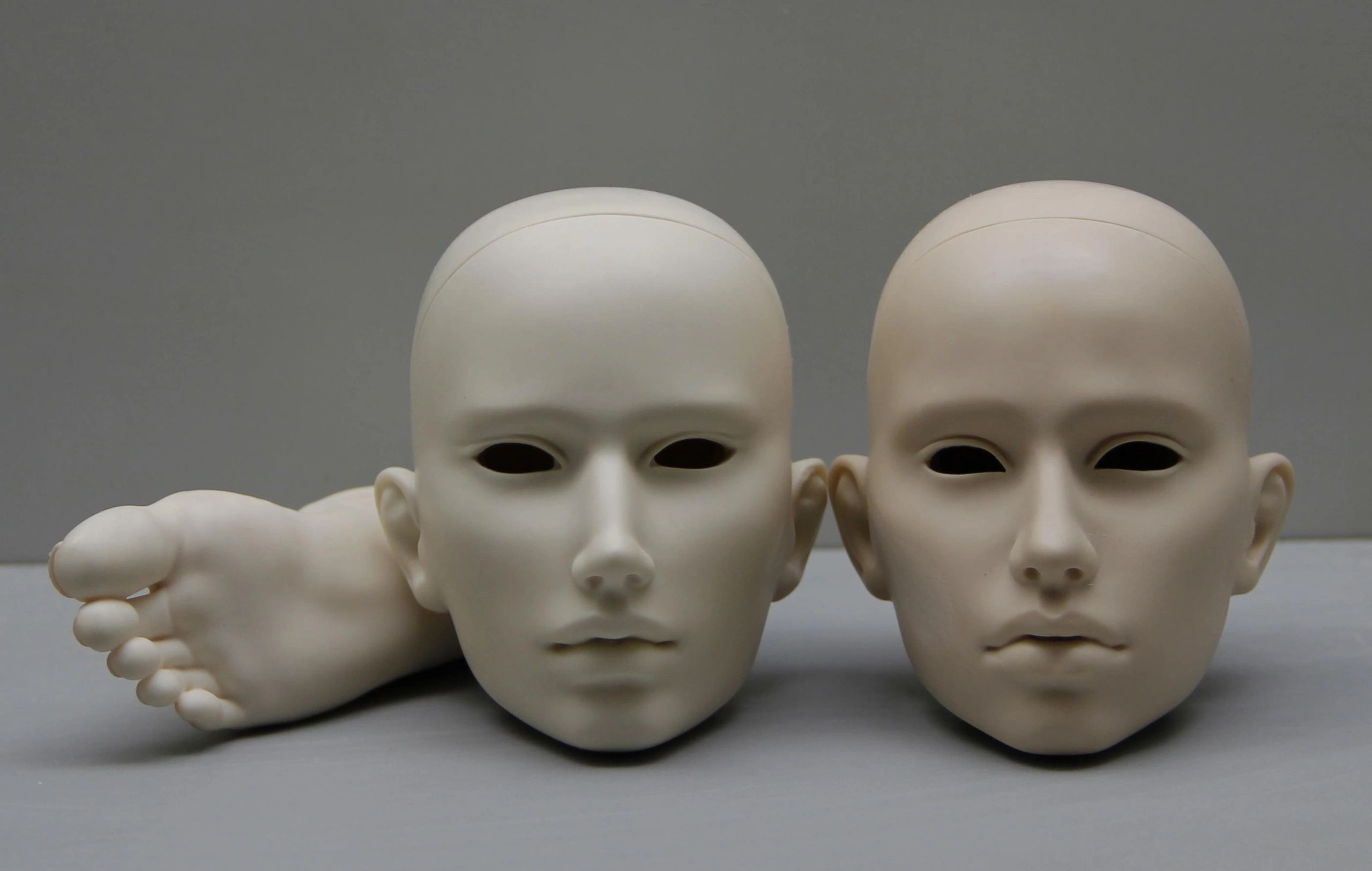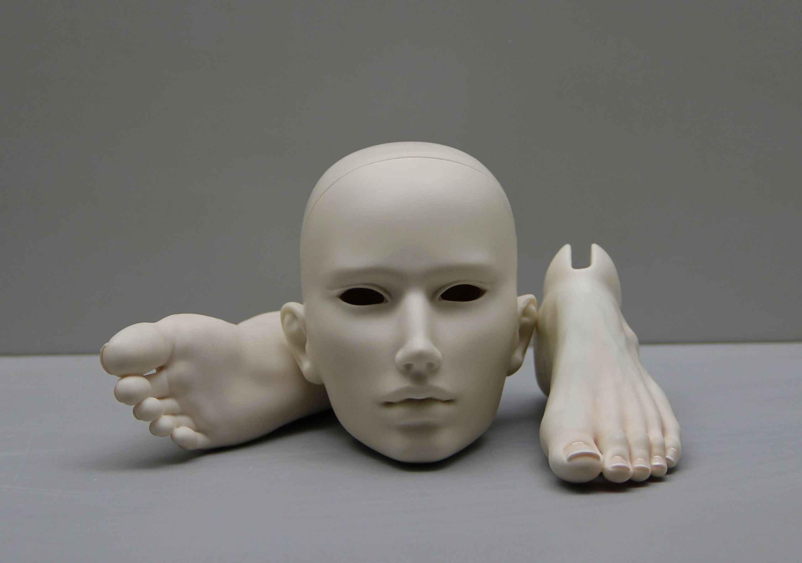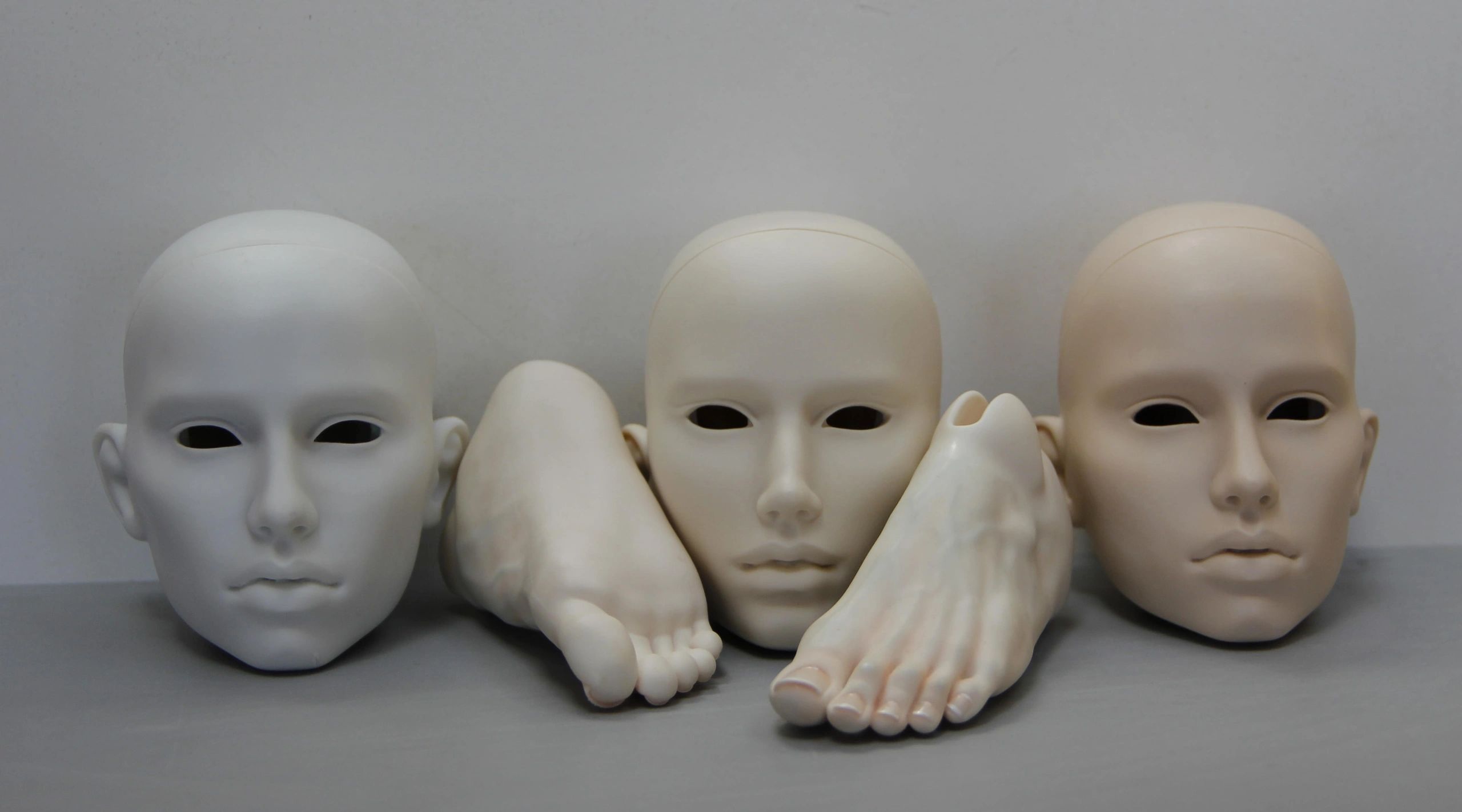 from left to right: Harlequion in Venetian Luna White resin, Jesse in Venetian Luna Magnolia next to Dollshe Knucci Fresh Skin resin feet, Harlequin in Venetian Luna Sunrise